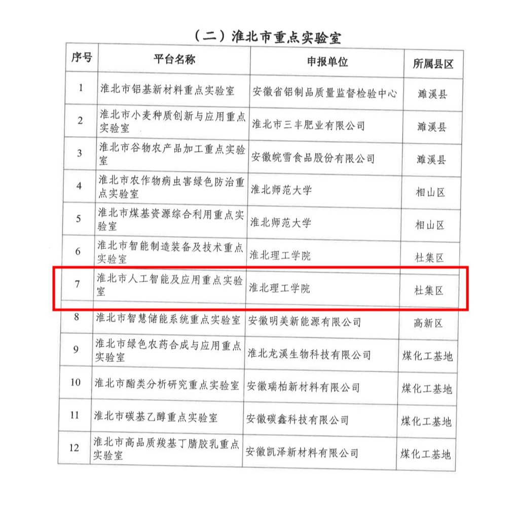 为进一步贯彻落实《关于加快推进科技创新平台建设的实施意见》(淮政办〔2023〕16号)精神,根据《关于印发<淮北市科技创新平台认定管理办法(试行)>和<淮北市科技创新平台绩效评价管理办法(试行)>的通知》(淮科〔2023〕16号)和《关于申报2024年度淮北市科技创新平台的通知》(淮科秘〔2024〕28号)文件精神,淮北市科技局经通知发布、组织申报、县区(园区)科技管理部门审核推荐、复核、专家评审、局党组会议研究同意、公示等程序,beat365中文登录入口beat365中文登录入口院申报的“淮北市人工智能及应用重点实验室”,获批立项建设。