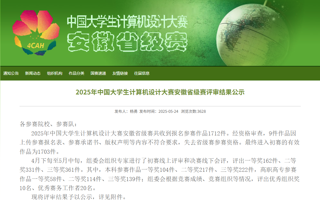 beat365beat365中文登录入口院学子在2025年中国大学生计算机设计大赛安徽省级赛中表现亮眼,凭借扎实的专业功底与创新实践能力,斩获多项荣誉。本次大赛中,我院学生共获得一等奖3项、二等奖3项、三等奖1项。取得了获一等奖数在全省参赛的43所本科高校并列第9名好成绩。其中4项作品被推荐参加在7月和8月份举行的全国总决赛。