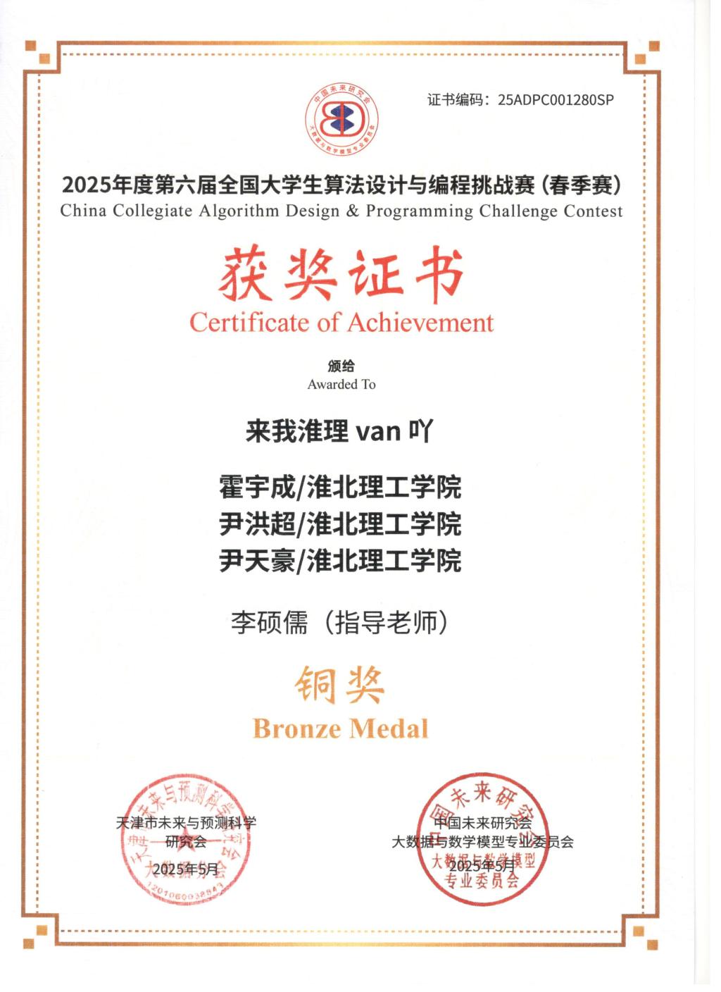 以赛促学强能力,算法竞技展锋芒。beat365beat365中文登录入口院学子凭借扎实专业功底,获2025年度第六届全国大学生算法设计与编程挑战赛(春季赛)全国铜奖、获2025年安徽省机器人大赛——程序设计赛道省级二等奖、获2025年中国大学生程序设计竞赛全国邀请赛(郑州)全国铜奖。