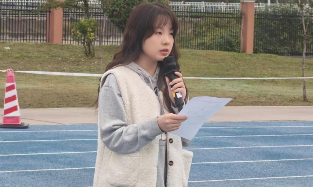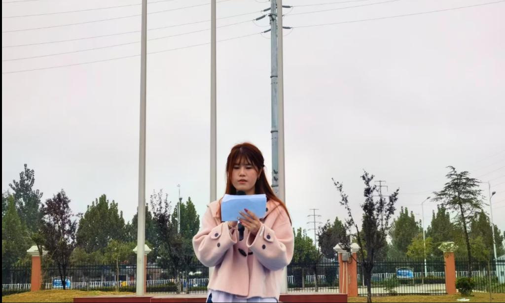 随后,2025级石梦阳同学作为学生代表发言。她的讲话以“爱国”为核心,从历史与当代两个维度阐述了爱国的深刻内涵。她讲到,“爱国”不仅是文天祥“留取丹心照汗青”的气节,是林则徐“苟利国家生死以”的担当,是周恩来“为中华之崛起而读书”的初心;更是当代青年在课堂上的专注、在实验室里的钻研、在运动场上的拼搏,是升国旗时心中的敬意与肩上的责任。她呼吁全体同学,要接过历史的接力棒,让爱国情怀在青春的赛道上绽放光芒,以实际行动为民族复兴贡献青春力量。