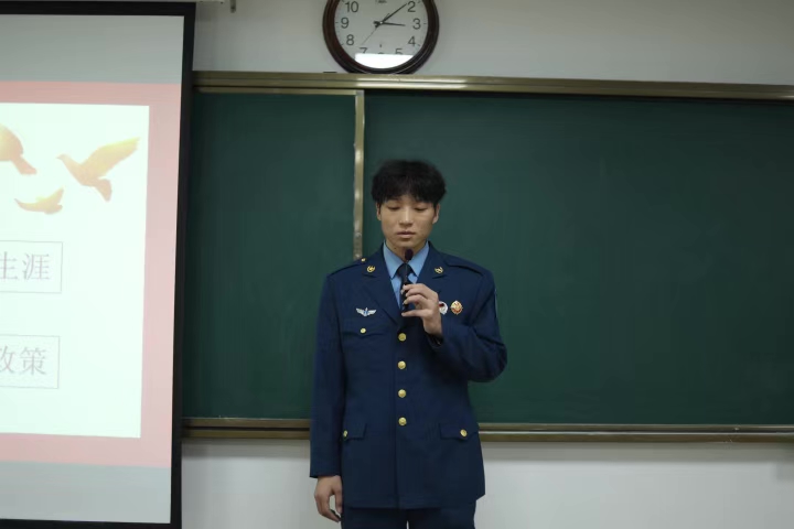 宣讲环节,宣讲团成员以"军营里的'技术闯关'趣事"为主题,分享了自己在服役时的经历。他结合自身经历,详解了大学生在部队技术岗位的发展优势,同时清晰解读了学费补偿、考研加分等核心政策,让政策知识在故事中落地。