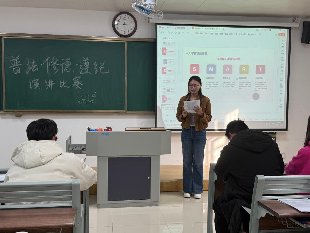 以讲践行,让修德遵纪成为行动自觉。演讲比赛不仅是思想的碰撞,更是文明实践的动员。参赛选手们从自身经历出发,分享在班级建设、志愿服务、社区实践中践行道德准则、遵守纪律规范的故事。比赛现场还设置“互动问答” 环节,评委们结合工科专业特色,就 “如何平衡技术创新与法律边界”“科研工作者的道德责任” 等问题与选手、观众交流探讨,引导学生将法治信仰、道德追求转化为日常行动,推动形成 “人人讲文明、事事守规矩” 的校园风尚。