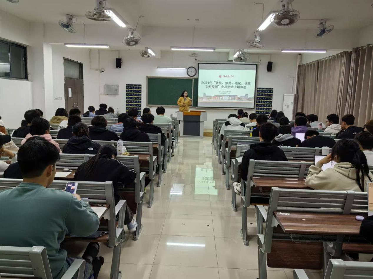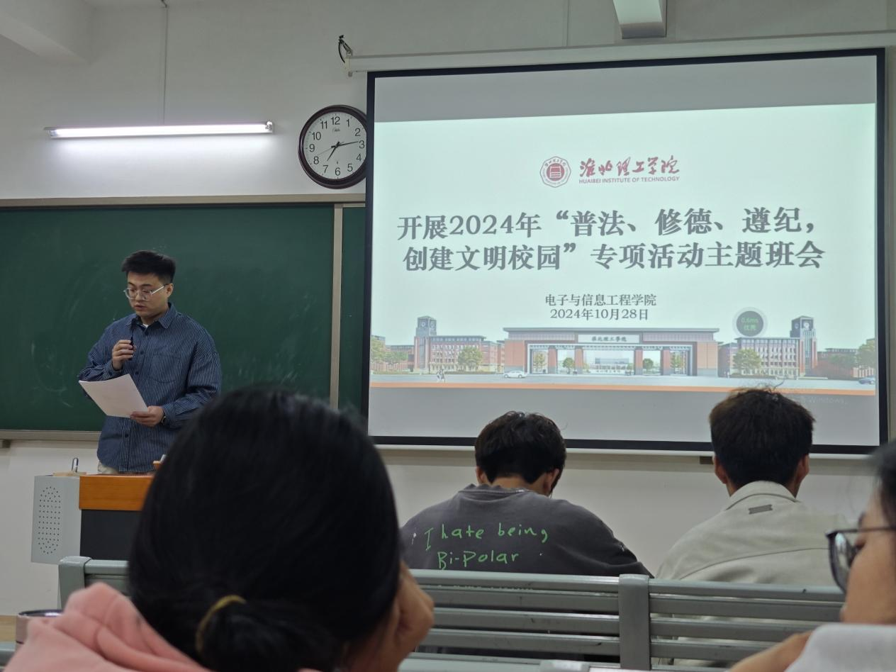 为贯彻落实立德树人的根本任务,坚持“依法治校,以德治校”。beat365中文登录入口院于2024年10月28日开展“普法、修德、遵纪,创建文明校园”的主题班会。此次主题班会旨在通过丰富多彩的宣传教育和实践活动,营造出一个法治、文明、和谐的校园环境。