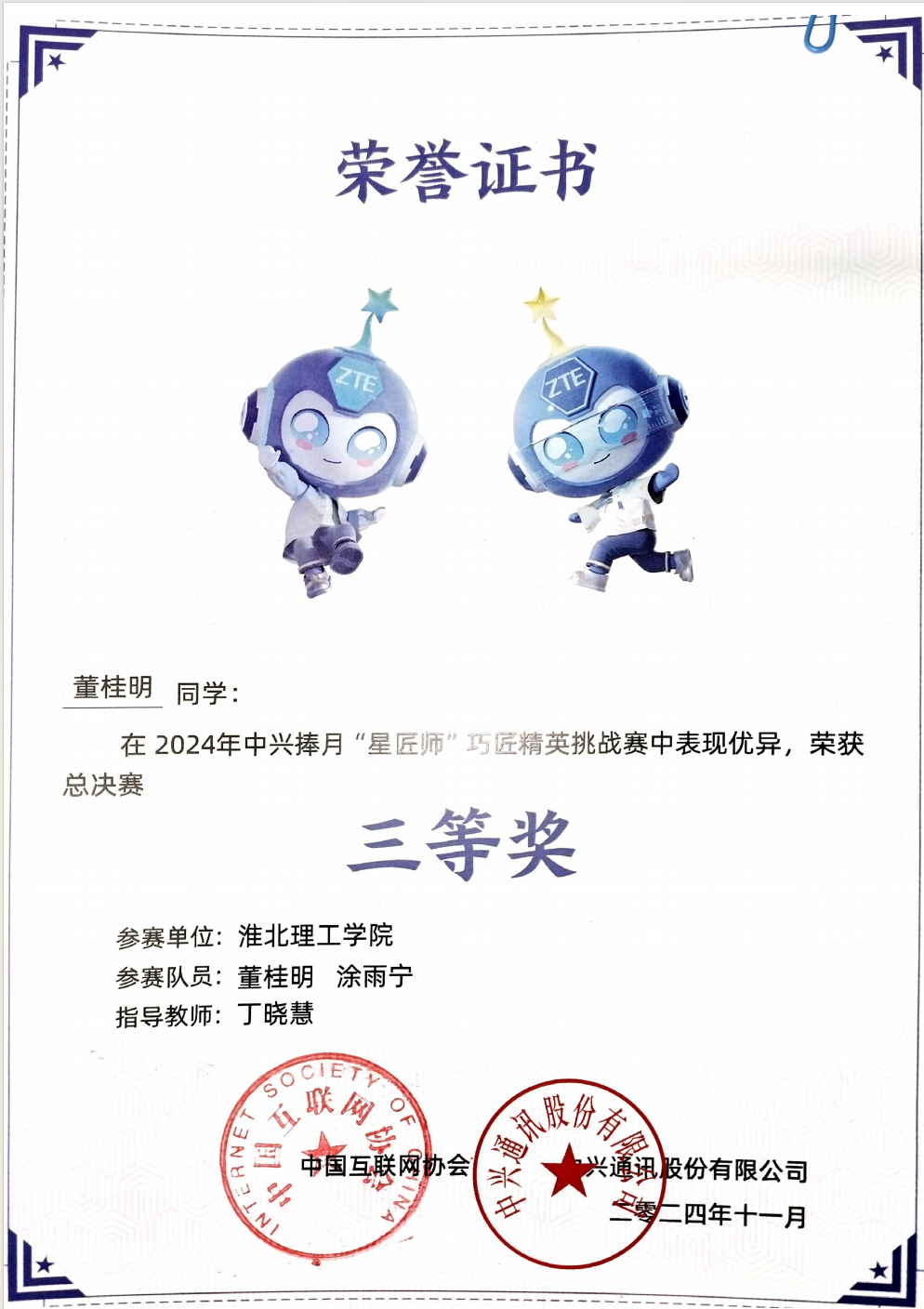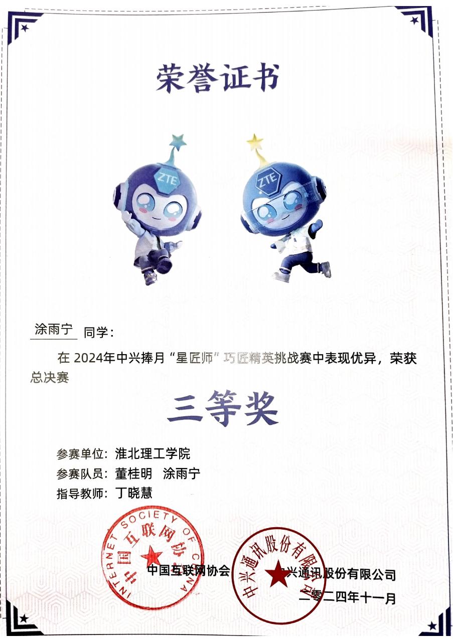 2024年10月27日,第十四届中兴捧月“星匠师”巧匠精英挑战赛全国总决赛在东南大学落下帷幕。本次大赛由中国互联网协会与中兴通讯主办、东南大学承办,旨在面向5G新基建培养具备扎实理论知识和实践能力的应用型人才。我院首次组织学生参赛,大赛实行“省级初赛+全国决赛”模式,我院4名学子组成2个团队与来自全国215所院校的627个团队参与角逐,最终2021级通信工程专业的董桂明、涂雨宁同学在省级比赛中顺利晋级,在全国决赛中荣获三等奖及1000元奖金的佳绩。