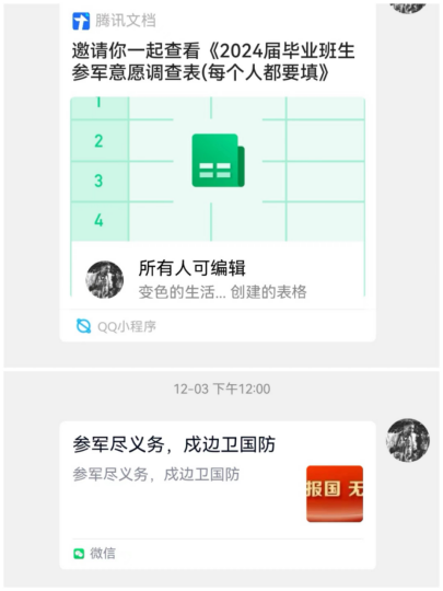 12月3日起,学院通过班级微信、QQ群、短信、电话联系等多种方式,将通知要求和有关政策及时推送给全体未就业男性毕业生,全面展开摸底调查,全覆盖核实了解应征意愿,填写入伍意愿调查统计表,形成台账。