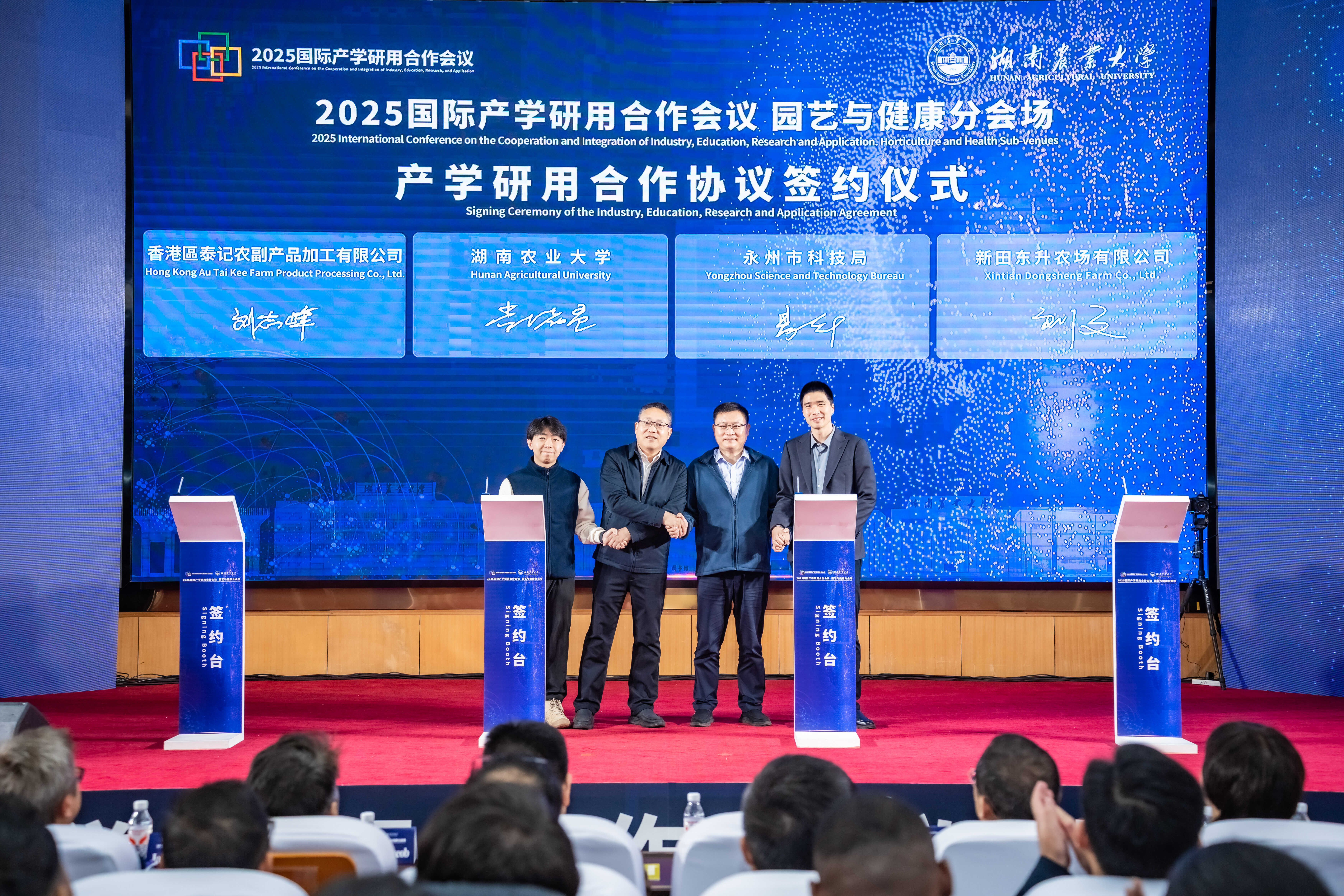 谢方平为新加坡南洋理工大学Jarkko Salojärvi教授、意大利帕多瓦大学Giovanni Battista Tornielli教授颁发兼职合作导师聘书。beat365园艺学科相关团队与永州市科技局、新田东升农场、香港区泰记农副产品加工有限公司签署四方合作协议;与益阳市资阳区人民政府、湖南沃工农业服务有限公司、泰国Suptawee Engineering Co.,Ltd.签署产学研用四方合作协议。永州市科技局党组书记、局长易先平,益阳市资阳区委常委、副区长万巍,beat365社会服务处副处长李绪孟分别代表各方上台签约。