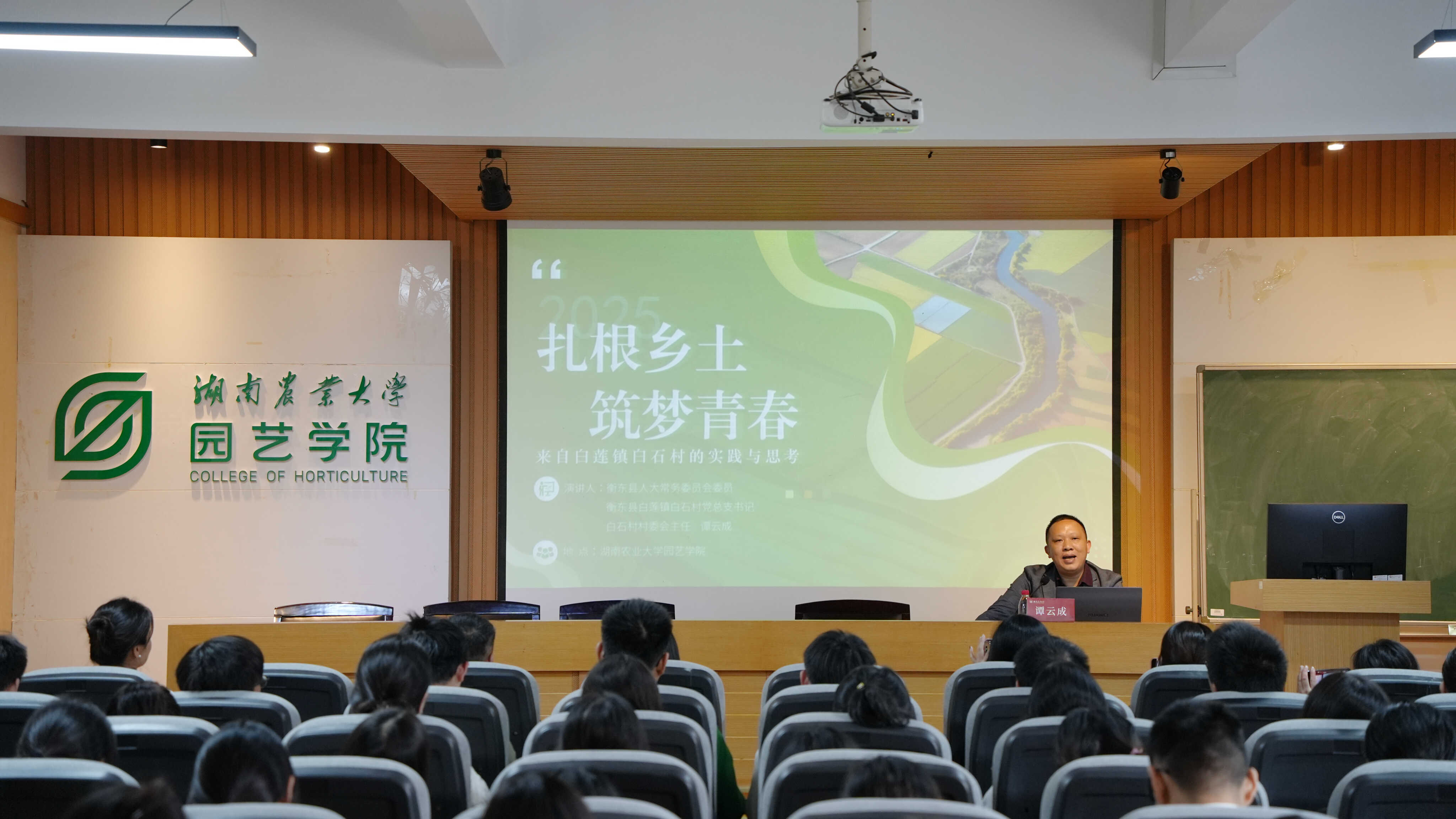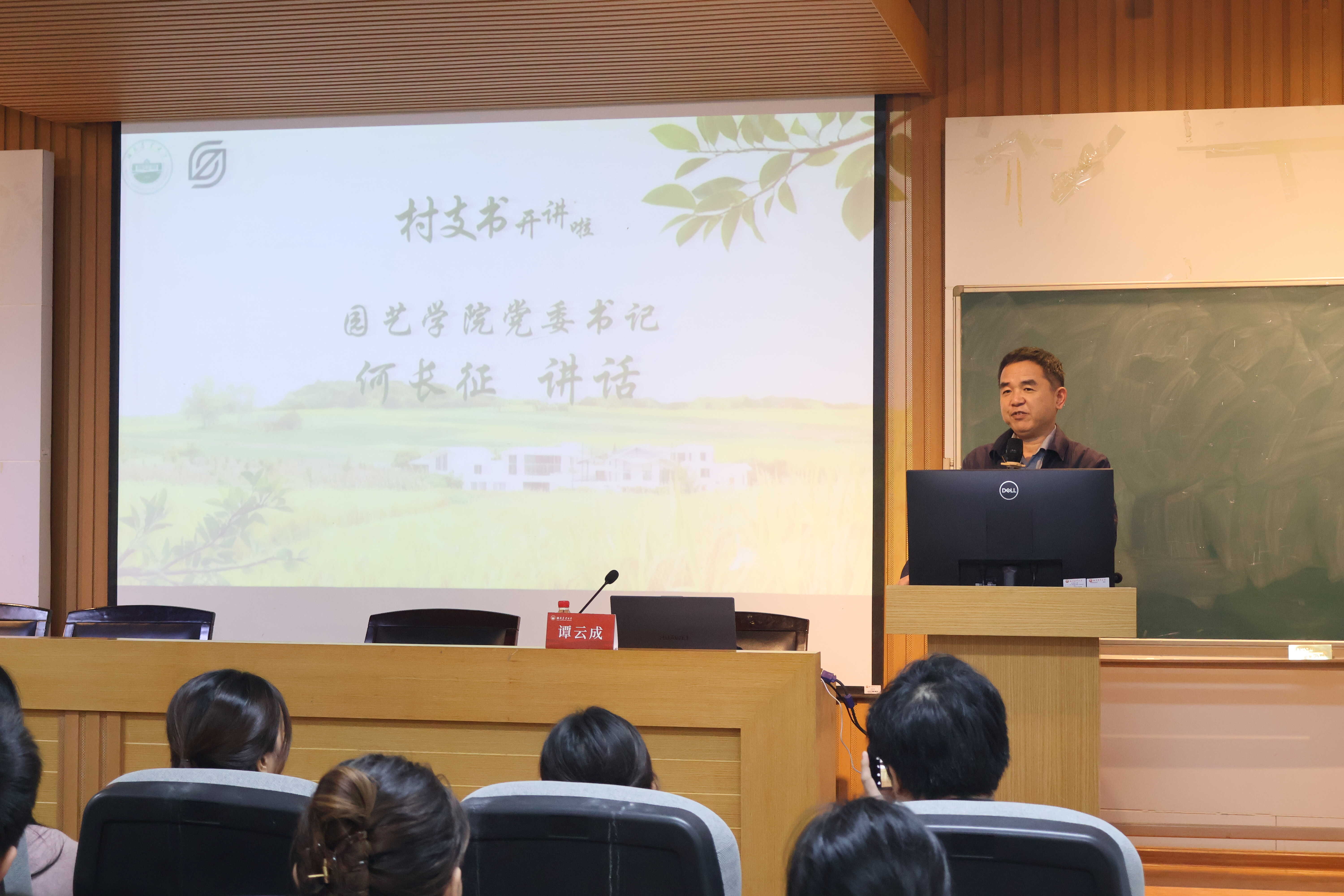 11 月 14 日下午,首期主题讲座在第十一教学楼北 539 会议厅举办。通过邀请经验丰富的村支书分享“三农”实践案例,让园艺学子直观感受基层治理温度、汲取乡村发展智慧,助力培养“懂农业、爱农村、爱农民”的复合型人才。本次活动特邀衡阳市衡东县白莲镇白石村党总支书记、县人大常委会委员谭云成主讲。学院党委书记何长征、白莲镇人民政府副镇长李诗莹、乡村振兴办等部门负责人、白石村村委等一行出席本次活动。活动由学院党委副书记喻诚主持。