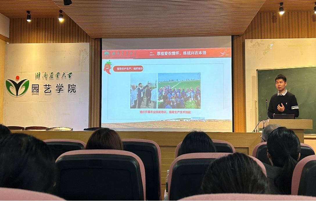 陈佳富详细分享了他于2024年暑期参与学院“红色+”博士团赴湖南省怀化市沅陵县进行科技服务专业实践活动的经历。博士团由党委书记何长征与院长武涛亲自带队,为沅陵县提供灾后复产指导服务。沈程文教授组织茶园栽培管理以及夏秋茶加工技术的专业培训,提升农户的专业技能水平。此外,博士团还策划了防溺水教育、自护能力培训、茶文化科普等一系列实践活动。活动中,博士团荣获校级“优秀团队”称号,陈佳富荣获校级“先进个人”称号。他表示,此次实践活动不仅丰富了自己实践经历,更为沅陵县的乡村振兴事业注入了新的活力与动力,充分展现了园艺学子建设美好家园的青春风采与责任担当。